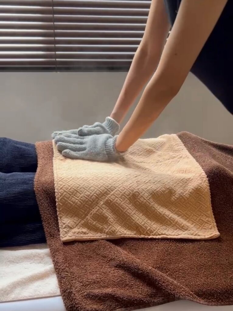 海水温熱は、海水で蒸した熱々のタオルを使い、ふくらはぎを含めた全身をしっかり温めていく施術です。体を温めることで冷えが和らぎ、ふくらはぎの柔軟性が少しずつ戻っていきます。