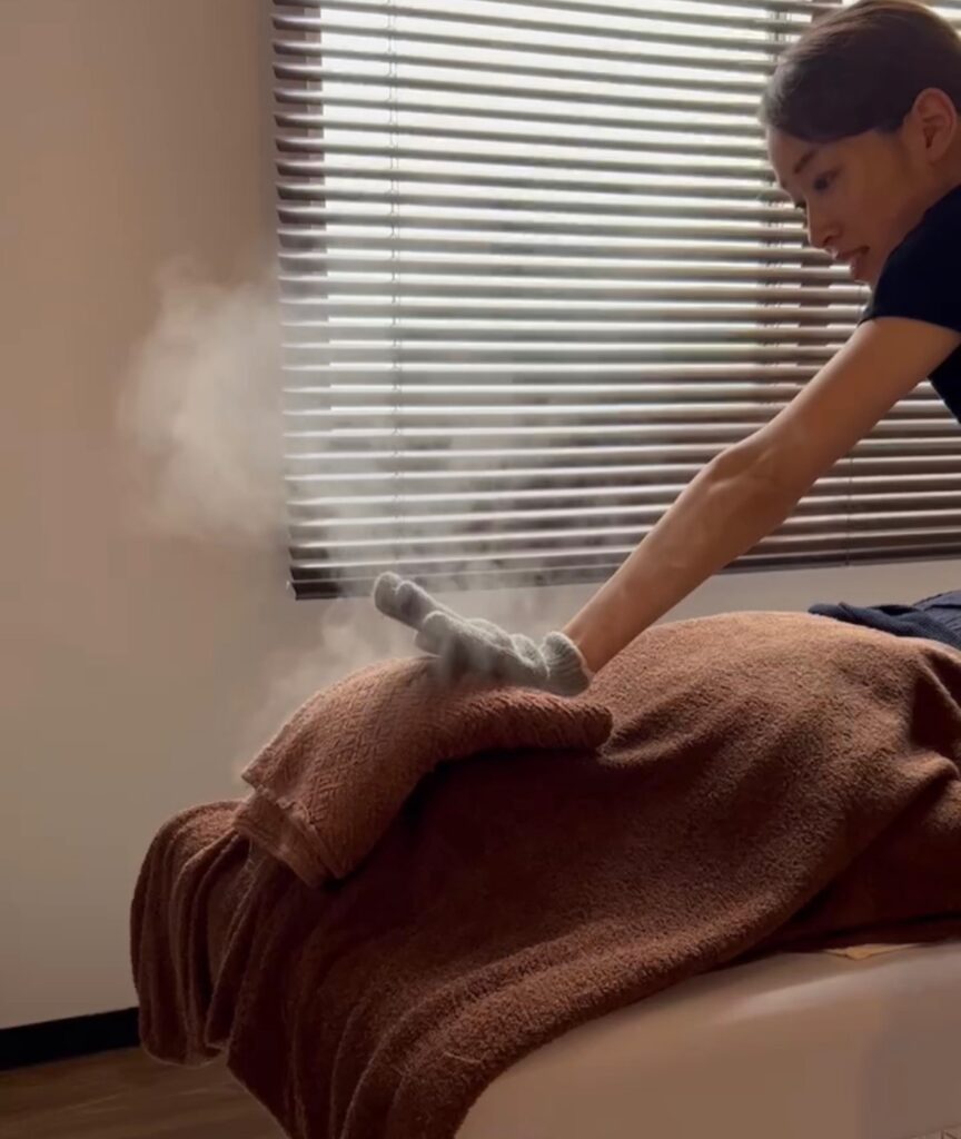 海水温熱は、海水で蒸した熱々のタオルを使い、全身をくまなく温めていく施術です。体が深く温まり、ふっと力が抜けると、自然と心にも余裕が戻ってきます。