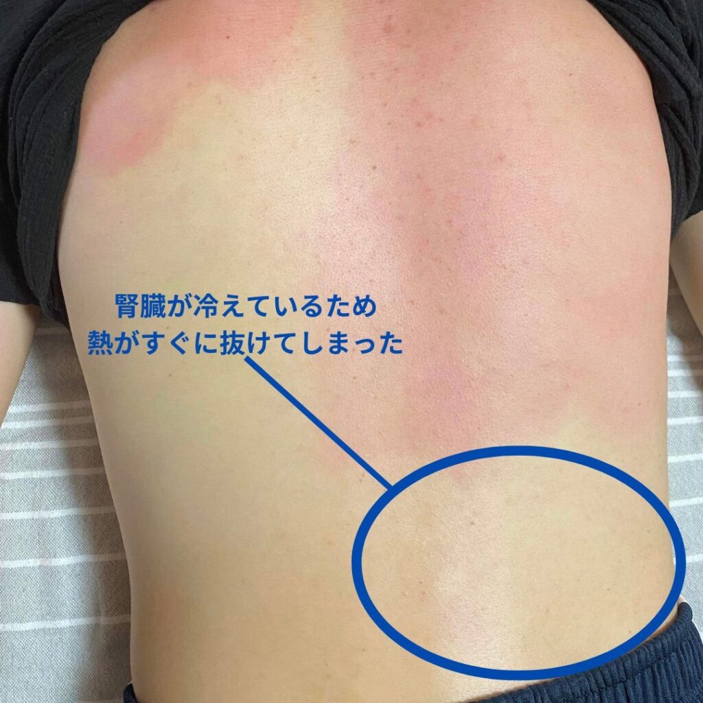 丸で囲っている部分が腎臓。温めても白いまま=冷えていて、熱が入りづらい